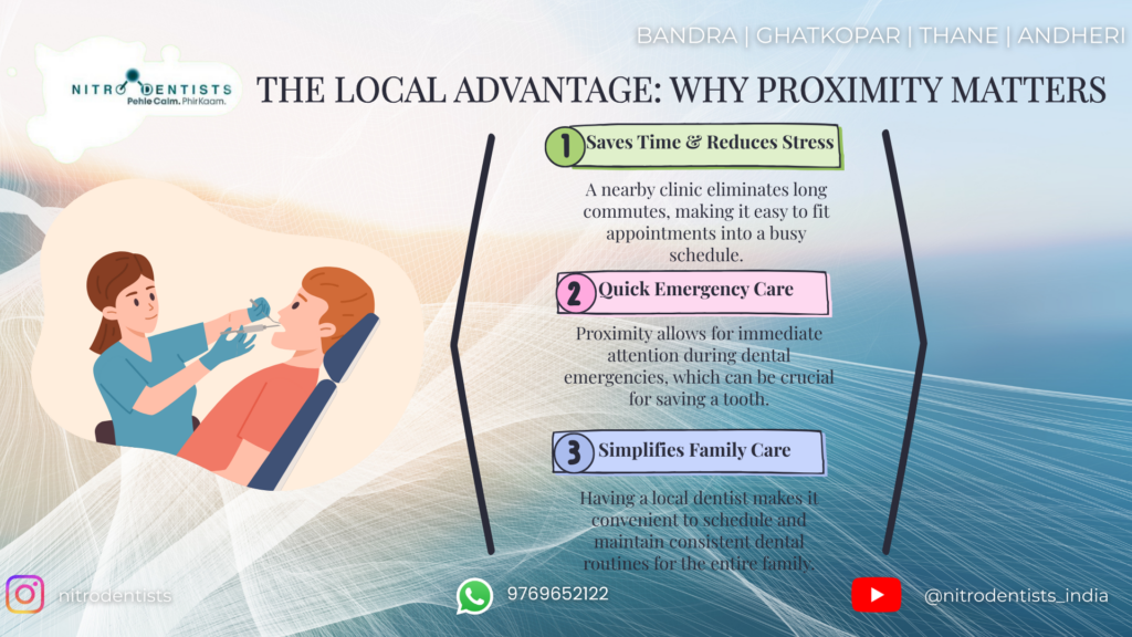Mumbai traffic is legendary, and the last thing you want when dealing with a toothache or a scheduled cleaning is to be stuck in transit for an hour. For residents near Makhija Royale and the surrounding Khar West area, Nitrodentists offers the ultimate luxury: time.