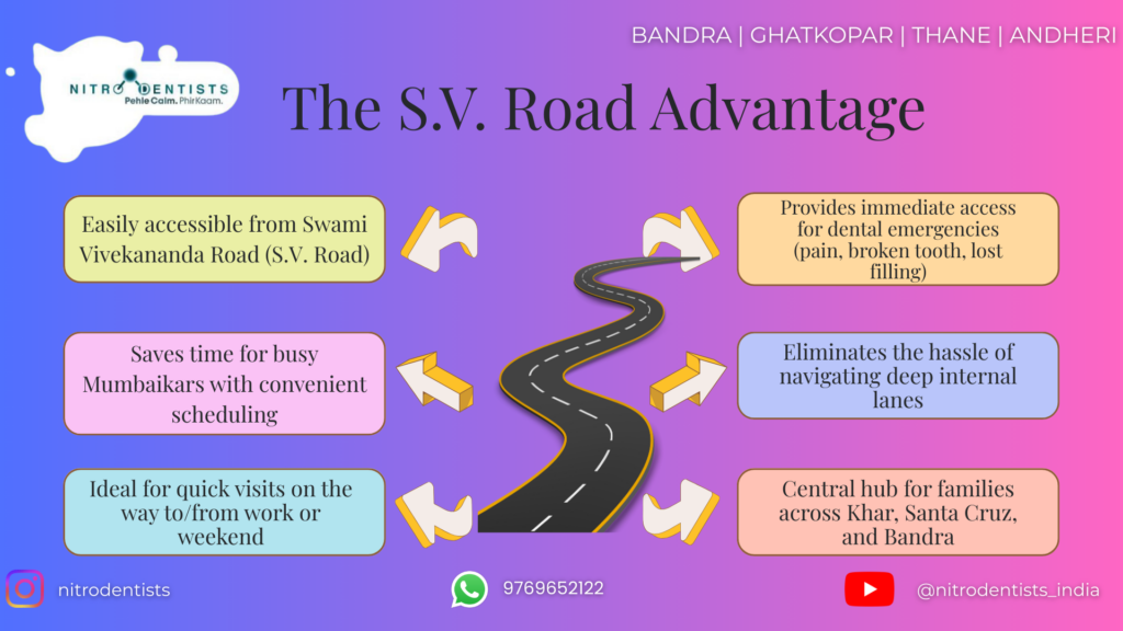 S.V. Road connects neighborhoods. For families spread across Khar, Santa Cruz, and Bandra, our clinic serves as a central, easy-to-reach meeting point for all your dental needs.