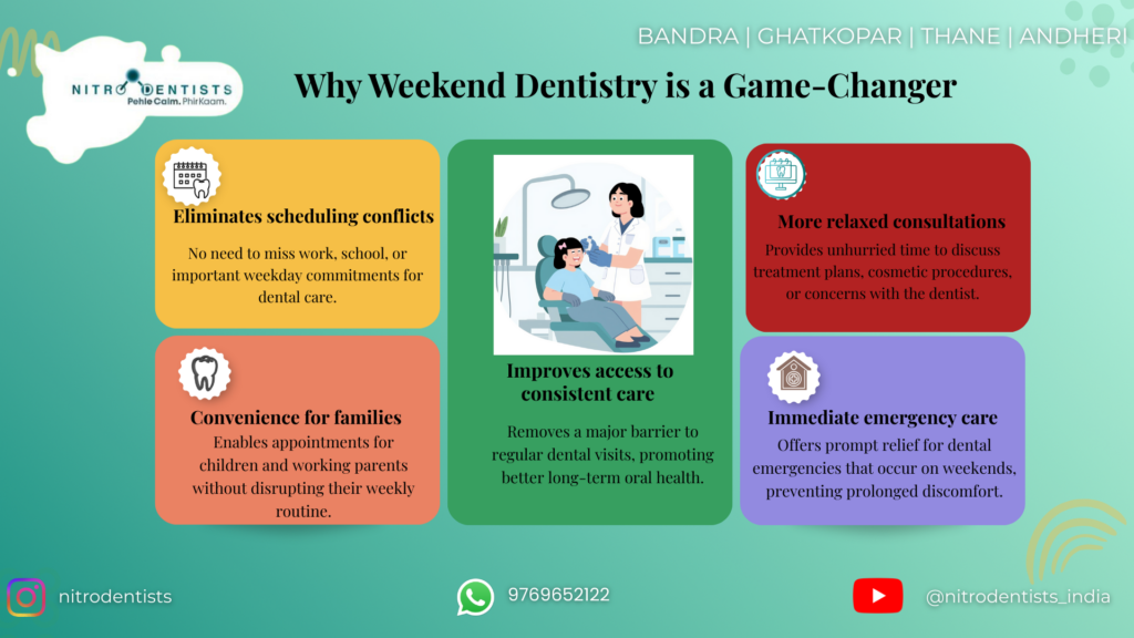 For many people in Khar West, a 9-to-5 dental clinic is a barrier to consistent care. Weekend availability removes that barrier, offering significant advantages.